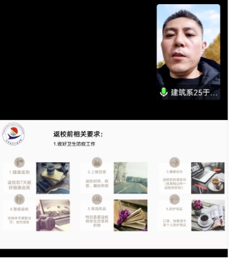 专业长钟美慧老师在会议上要求全体学生做好收心拢神工作,尽快从假期状态中恢复到正常上课状态,同时要求土木19级同学关注自己的学分绩点,安全返校。辅导员于敦续明确了开学返校和补考的时间,而后从返校前要求、疫情防护、乘车安全、预防诈骗等方面对全体同学提出了具体要求,讲解了学校寝室管理制度、德育学分制度和降级制度,希望同学们返校后遵守学校规章制度,勤奋学习。