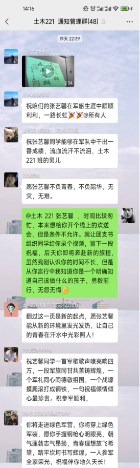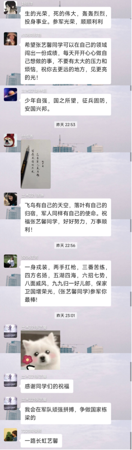 青春只有一次,他选择了最精彩的样子。张艺馨同学表示,参军入伍是大学生成长成才、提升思想境界、锻炼意志品格、提升综合能力的重要途径。他一定会在部队中自觉接受历练,争当一名听党指挥、能打胜仗、作风优良的新时代革命军人,为实现军队和国防现代化不懈努力!