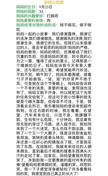 “知恩于心,感恩于行",因爱而感动,为爱而行动。在活动过程中,同学们需亲手为妈妈制作一张“亲情小档案”,回忆着与妈妈生活的点点滴滴,其实在母亲的心里,无论我们到了哪个年纪,都还是她怀里的小孩。我们慢慢长大,母亲却日渐变老,无边无际的是天空,一望无际的是大海,而比天空辽阔,比大海宽广的,只有世间最平凡的母爱。这份爱,伴随着我们一生,充盈我们的生命。