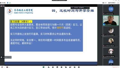 紧接着,刘子豪老师再次强调了毕业与就业的相关要求,以及下一阶段的学业、实习以及毕业设计的要求与时间安排,提醒同学们要珍惜剩下的大学时光,合理规划好自己毕业前各项事宜,确保顺利毕业。会议最后,刘子豪老师再次强调了实习安全的问题,希望全体同学在接下来的实习工作中,时刻注意自身安全和财产安全,外出注意交通安全,警惕传销机构陷阱,避免电信诈骗,发生任何问题一定要第一时间联系专业和辅导员。