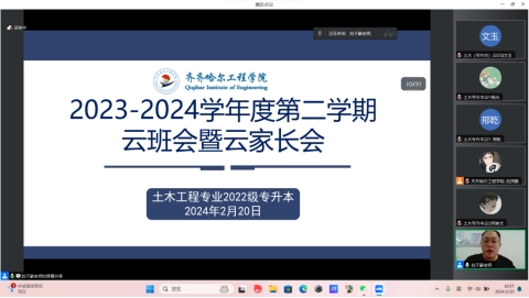 为帮助土木工程专业2022级专升本提高毕业设计的质量以及更好的解决就业问题,12月20日16时,辅导员刘子豪老师采用腾讯会议方式召开2023-2024学年度第二学期云班会暨云家长会,土木工程专业专业长、生涯导师和2022级专升本全体同学及家长参加会议。