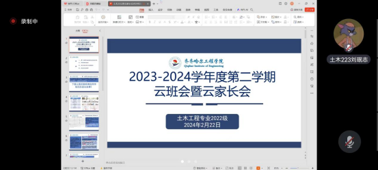 为加强家校联动,在开学之际保障学生返校过程中的安全,帮助家长更好了解校情及学生动态,以便更好地打造家校联动育人平台,建筑工程系辅导员刘子豪于2024年2月22日14时组织召开土木工程专业2022级2023-2024学年度第二学期云家长会暨云班会,土木工程专业专业长、生涯导师和2022级全体学生及家长参会。