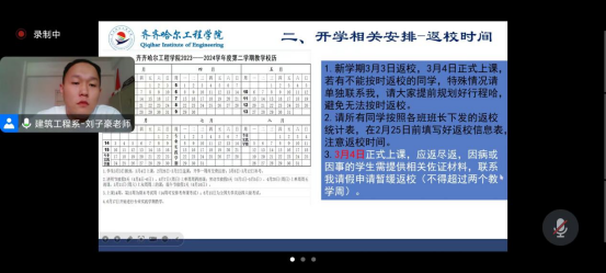 会议伊始,辅导员刘子豪老师对参与会议的各位家长表示欢迎,首先由土木221班王芳同学和土木223班唐剑扬同学作为学生代表分享了自己的学习经验和成长经历,刘子豪老师对第一学期进行总结,并对开学返校时间和要求进行详细说明,并从学习、生活、返校相关事宜及注意事项等多个层面对家长们可能存在疑虑的地方一一解答。随后,刘子豪老师对于学分绩点与公选课要求进行了深入解读,给家长和同学们重点介绍了我校的学分绩点毕业要求。最后刘子豪老师叮嘱同学一定要注意返校期间的出行安全问题,及时报备自己的行程,确保平安出行,安全返校。