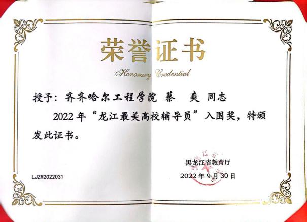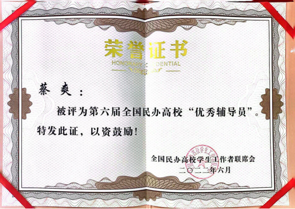 2022年被评为第六届全国民办高校“优秀辅导员”、同年9月荣获“龙江最美高校辅导员”荣誉称号;参加工作以来,多次荣获学校“优秀教育工作者”“优秀共产党员”“先进党务工作者”荣誉称号,其所带领的支部被评为“先进基层党组织”。2023年荣获“黑龙江省高校辅导员年度人物提名”称号
