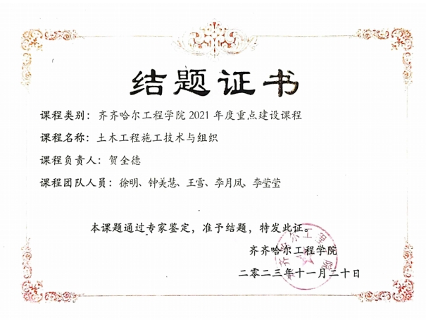 2019年3月就职以来,一直坚守在教学一线,为本专科讲授《建筑工程施工技术》《土木工程施工技术与组织》《工程地质》《工程地质与土力学》《土力学与基础工程》等多门课程。其中工程地质实习已成为学生们非常喜欢的实践项目;《土木工程施工技术与组织》课程经过几年建设,2023年11月被授予“校级一流课程”,其慕课已在学堂在线平台上平稳运营,已超过1000名学习者;2023年11月《工程地质与土力学》也被列为校级重点建设课程。