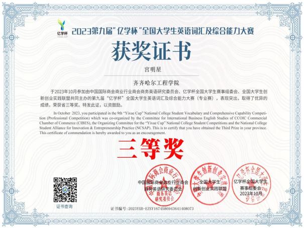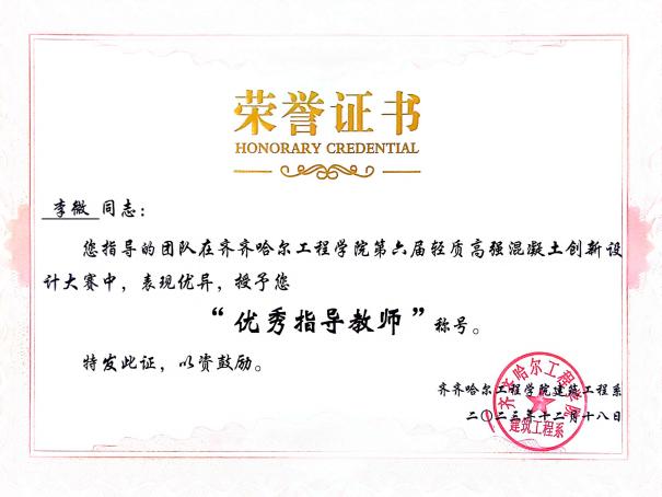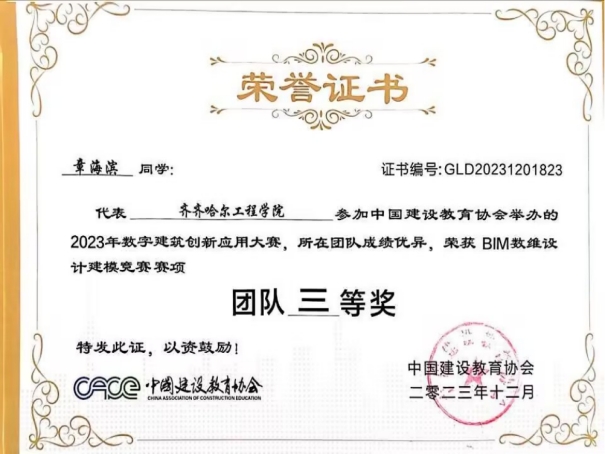 她作为生涯导师,积极鼓励学生参与科研实践,培养创新思维,多次指导学生参与创新训练计划。通过比赛能够对专业知识和各项技能有所提升,在备赛过程中,尽可能地为学生提供一切帮助和指导。他所指导的学生多次在创新创业、学科竞赛和兴趣爱好比赛中荣获荣誉,同时也多次获得优秀指导教师称号。其中工管211班章海滨获得全国2023年数字建筑创新应用大赛团队三等奖。