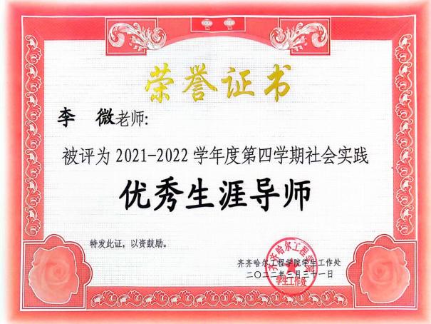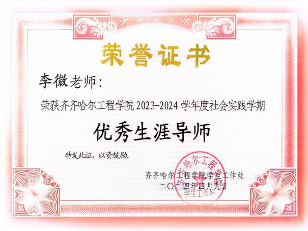 自从担任生涯导师以来,她始终关注学生的全面发展和长远规划。她深知每个学生都拥有独特的潜能和兴趣,因此致力于通过个性化的指导和支持,帮助学生发现自我、认识自我,并制定出符合自己兴趣和能力的生涯规划。在指导过程中,她注重培养学生的自我认知能力、决策能力和行动力。她鼓励学生主动探索、积极尝试,通过实习、志愿服务等活动积累实践经验,为未来职业发展奠定坚实基础。他从学生大一入学开始引导学生制定未来职业规划,根据规划反向制定学习计划。同时,他还为学生提供丰富的职业信息和资源,帮助他们了解不同行业的发展趋势和就业前景,从而做出更加明智的职业选择。他指导的学生多次在专业实践学期和社会实践学期荣获表扬信和多项荣誉。