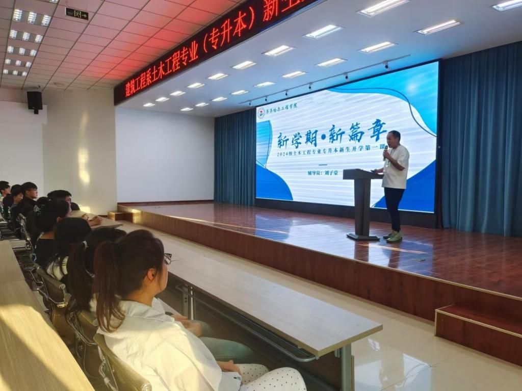 2024年9月1日,建筑工程系辅导员刘子豪老师组织2024级土木工程专升本新生在二教2508召开入学第一课。全体专升本新生、学长以及连队教官参加。