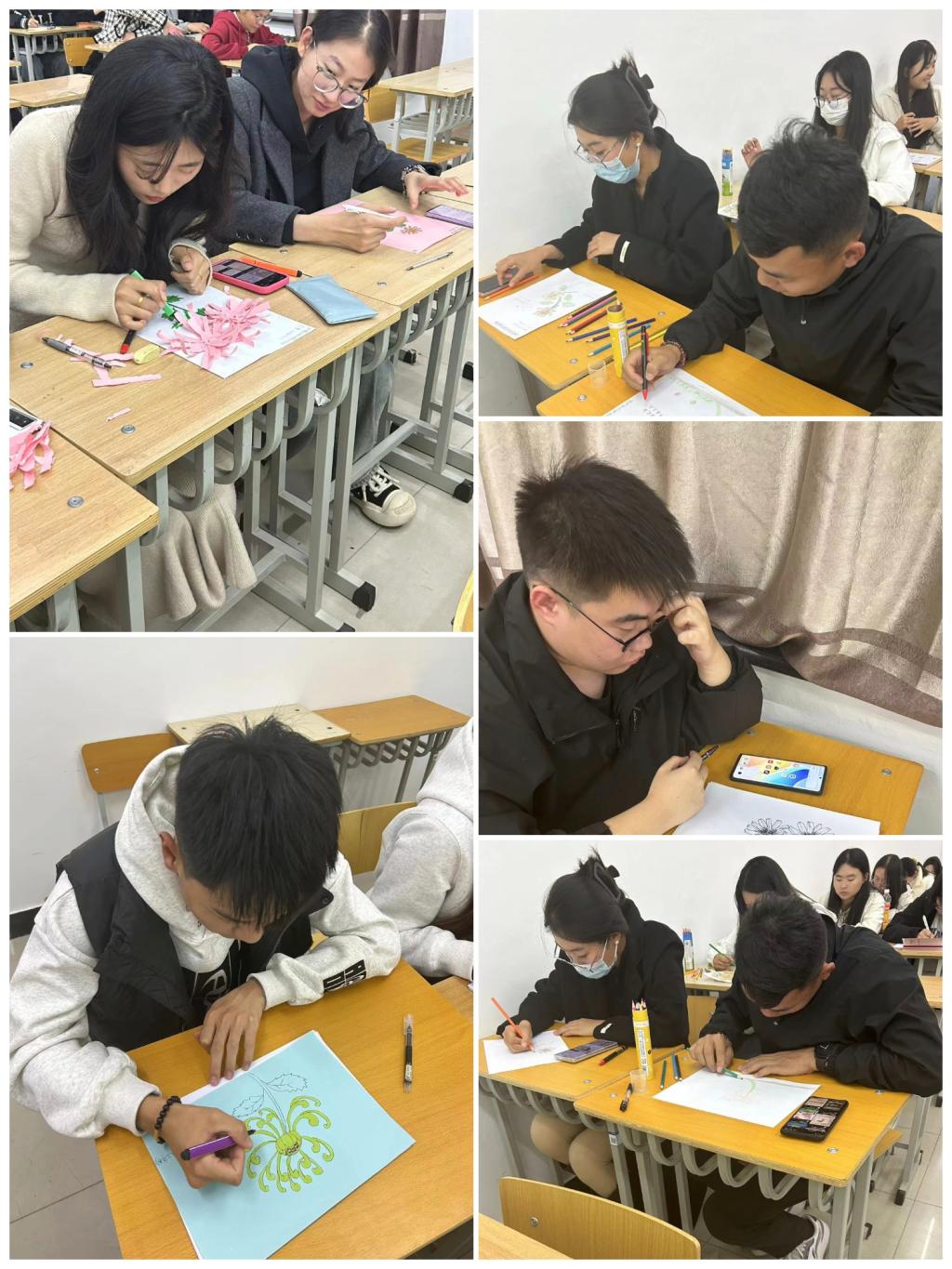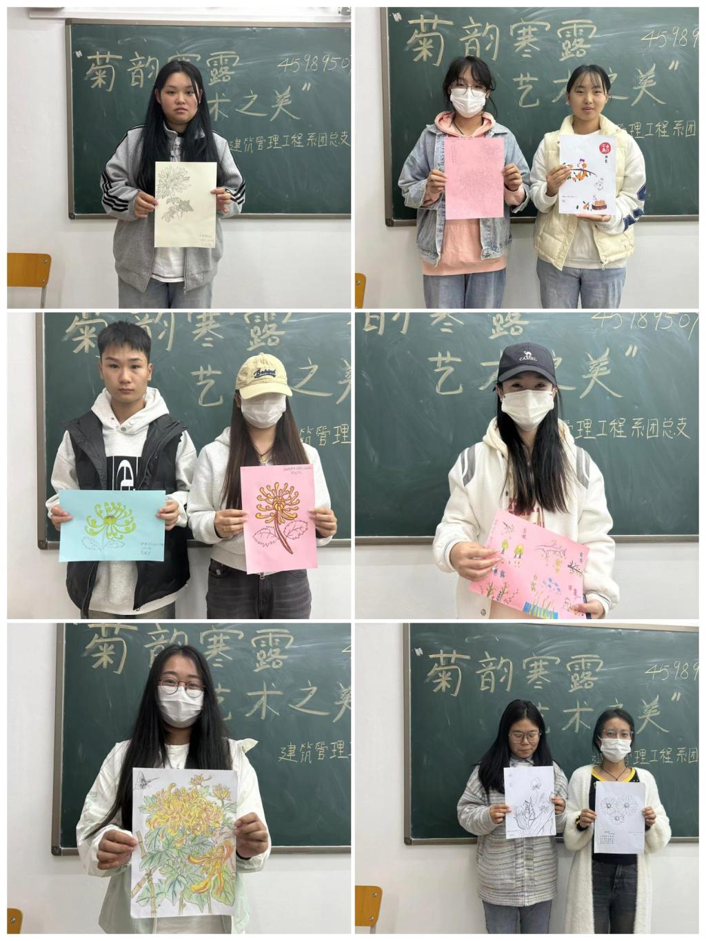 活动开始前,组织部李景婷介绍了活动的有关要求,知道寒露节天气变寒冷的气候特点,初步了解寒露节气:鸿雁来宾“菊有黄华”的物候特点。欣赏感受菊花的造型并尝试完成作品。绘画方式包括不限于水彩画、水粉画、油画、木板刻画、铅笔画、钢笔画、马克笔画、拼贴画、工笔画、水墨画、浮世绘等。比赛现场气氛热烈,选手们精神饱满、激情洋溢。赏菊不仅仅是为了欣赏菊花美丽的外表,更重要的是菊花所象征的高洁、坚韧的精神品质。同学们将自己心中的菊花画出来,向往心中的美。比赛最终由建筑管理工程系团总支评出一等奖一名、二等奖两名、三等奖三名、优秀奖若干。
