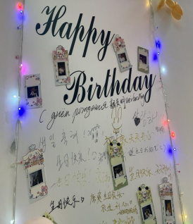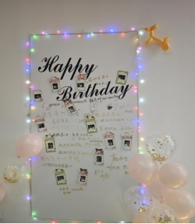 生日会现场,生日墙和许愿树成为了现场的亮点,工作人员为前来参加生日会的同学分发签名笔和许愿卡,同学们纷纷在生日墙上写下自己的生日祝福,在现场与老师进行拍立得合照粘贴到了生日墙上,“寿星”同学也在许愿卡上写上了自己的愿望,并小心翼翼的将许愿卡挂在许愿树上。