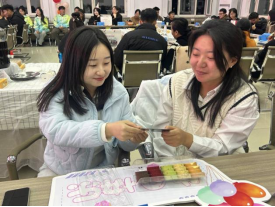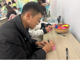 随着建筑管理工程系的同学们带来的开场舞表演,生日会正式开始。活动开始后,老师们用马克笔在贺卡上写下了对“寿星”同学们的生日祝福,并亲手送给了他们。紧接着进入了“秋叶绘秋意”绘画环节,此环节由老师和同学们共同完成,完成创作后由同学上台分享。在此次活动中还特设了才艺、游戏转盘抽奖环节。同学们纷纷登台积极参加游戏,现场气氛热烈而欢快。