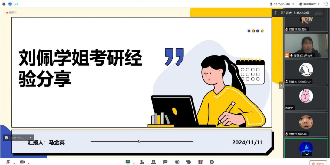 为了给同学们提供宝贵的考研经验和指导,2024年11月15日18时30分,一场别开生面的线上考研经验分享会如期举行。本次分享会由财务管理专业马金英老师主持,由财管204班的优秀毕业生刘佩学姐分享经验与心得。