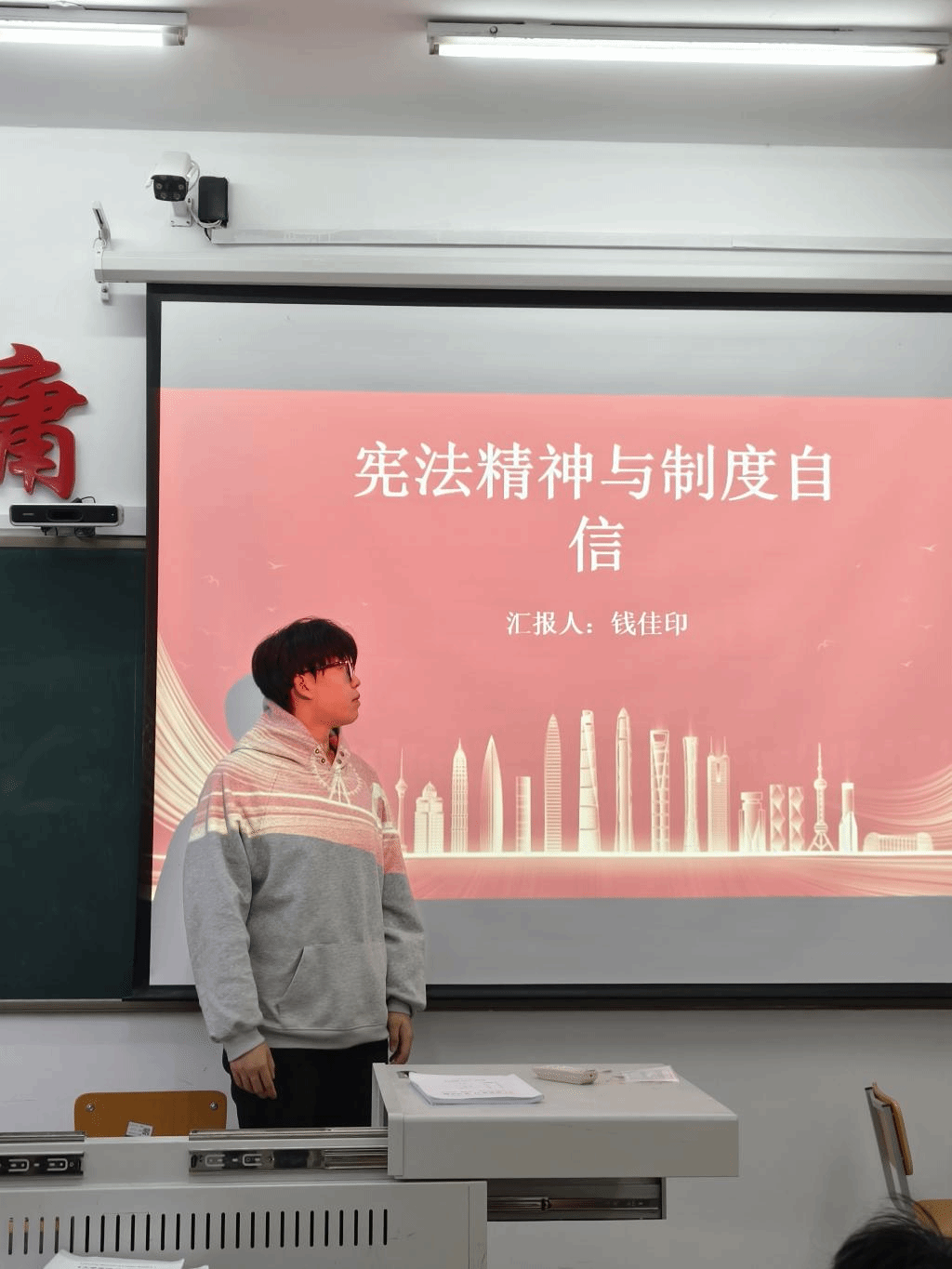 活动中,团支书钱佳印带领我们开展“尊崇宪法法律,弘扬宪法精神坚定制度自信”主题团课后,内心满是触动与收获。 团支书结合生活实例解读宪法,讲述宪法发展历程与公信力,从新中国成立初立宪探索到如今屡次完善,字里行间都是时代烙印。它与时俱进,吸纳社会需求,不断调整,为国家稳健前行夯实法治根基。团支书提醒同学们要做守法先锋,日常言行对标宪法,网络发言谨守法规界限,抵制不良舆论。更要普法,用所学助力社区法治宣传,带动身边人守法护法。