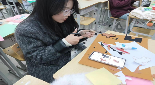 在活动现场,气氛热络,大家对于不织布作品制作跃跃欲试。开始制作前,周晓纤详细讲解了不织布的制作技巧和文学元素的融入方法,让同学们在动手实践中感受艺术与文学的完美融合。随后,大家纷纷拿起手中的工具,用心地剪裁、缝制,将自己对文学作品的理解和感悟通过不织布的形式展现出来。在创作的过程中,同学们相互交流、相互启发,团结协作,共同创作独一无二的作品。